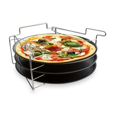 Pour les grands gourmands ou pour de nombreux convives, ces 3 plaques à pizza avec support permettent de cuire jusqu’à 3 pizzas de diamètre 30 cm en même temps. Pratiques, les plaques sont anti-adhérentes pour un entretien facilité et une durée d’utilisation plus longue.