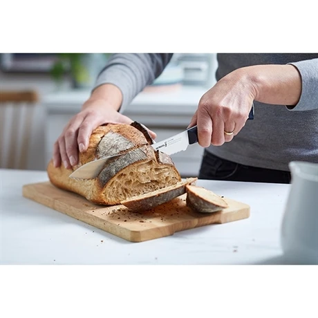 Le couteau à pain Intempora N°218 proposé par Opinel est inspiré du design du couteau traditionnel Opinel, apportant le même confort de prise en main et une qualité de coupe exceptionnelle. Robuste, sa lame est en acier Sandvik 12C27 modifié, un acier inoxydable doté d’une haute teneur en carbone pour un tranchant très efficace et une grande résistance à la corrosion. La lame plein-soie se prolonge dans tout le manche et contribue à la robustesse et à l’équilibre du couteau, le poids étant réparti. Armé face à l’usure, aux chocs et à l’eau, ce couteau à pain comporte un manche surmoulé chargé en fibre de verre. Maniable, sa forme galbée au profil triangulaire assure une prise en main sûre et confortable. Couteau idéal pour une découpe quotidienne efficace de vos pains grâce à sa lame courbée et dentée permettant d’amorcer la coupe facilement et de trancher tous les types de pains.